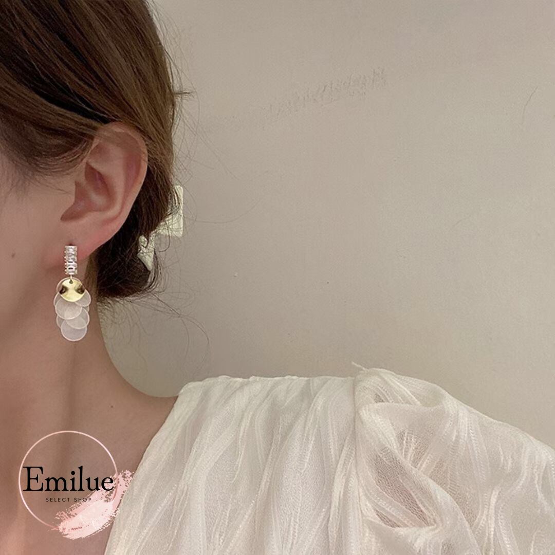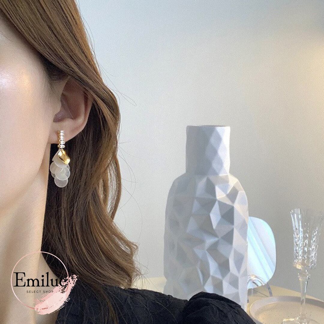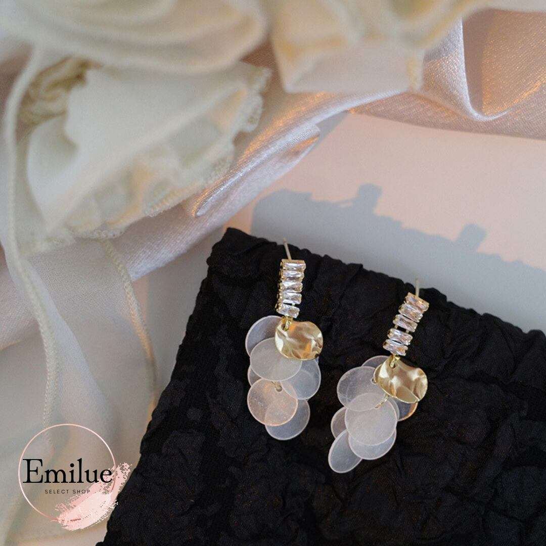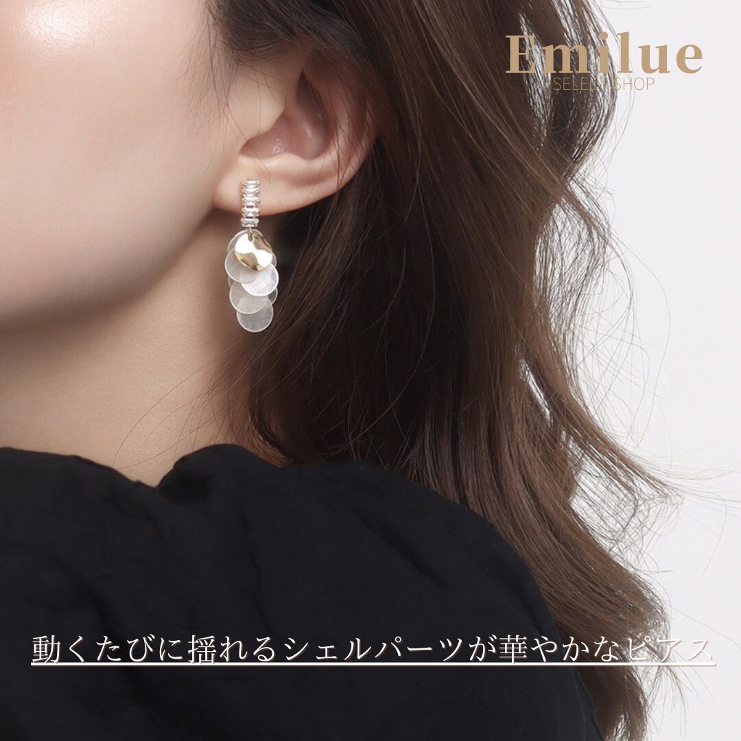 キラキラ輝くラインストーンに、丸いメタル・シェルパーツが数枚組み合わされたタッセルピアスです。動くたびに揺れるパーツが華やかな印象を与えます。