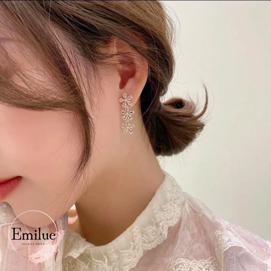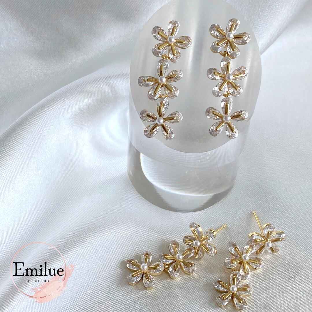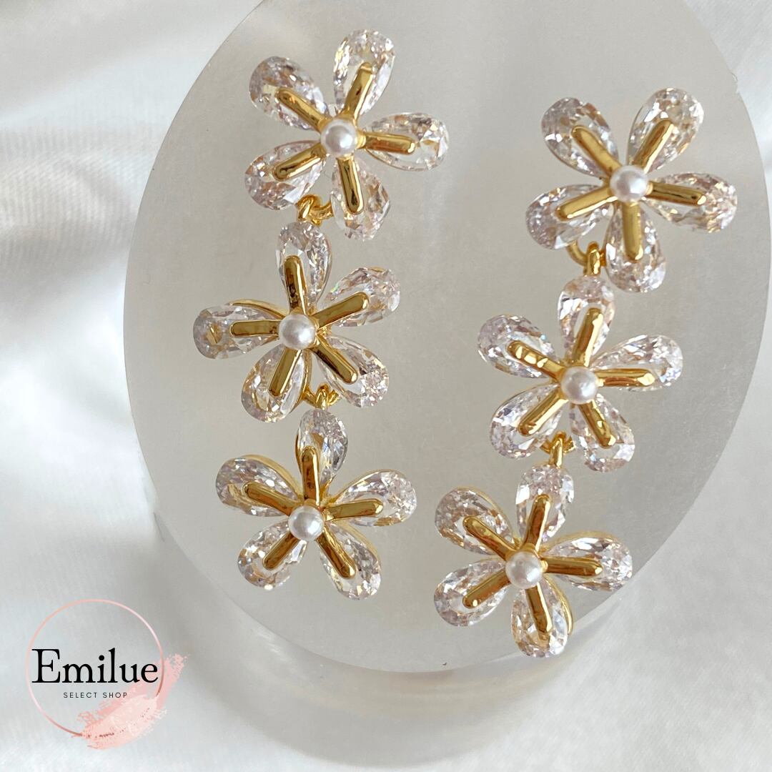 3つ連なったお花が耳元でキラキラ揺れる可愛らしいピアス。涼しげなクリアカラーで春夏にオススメです!