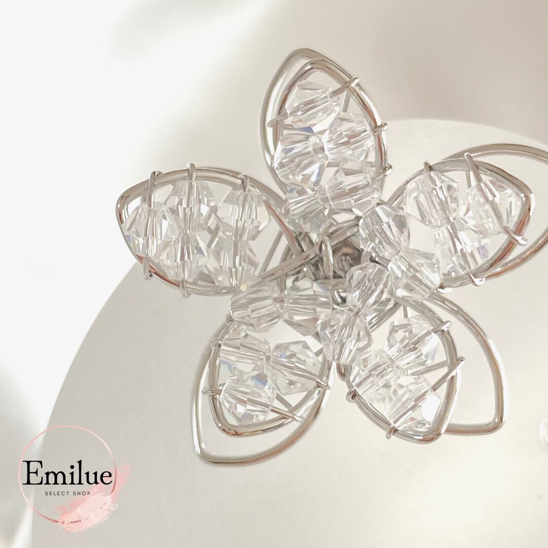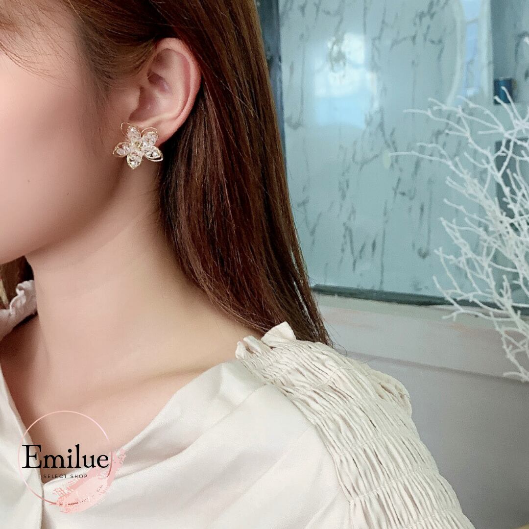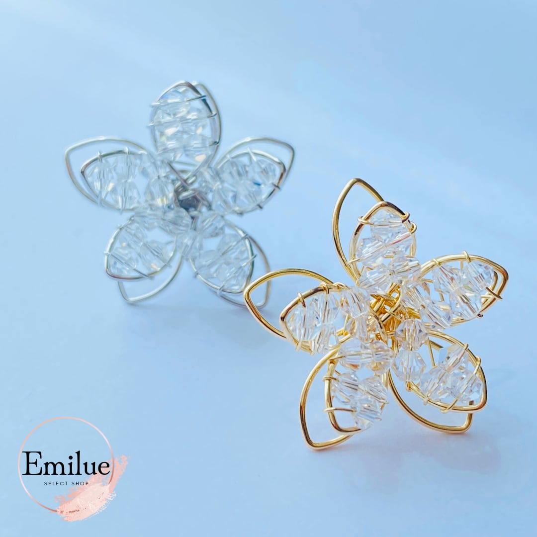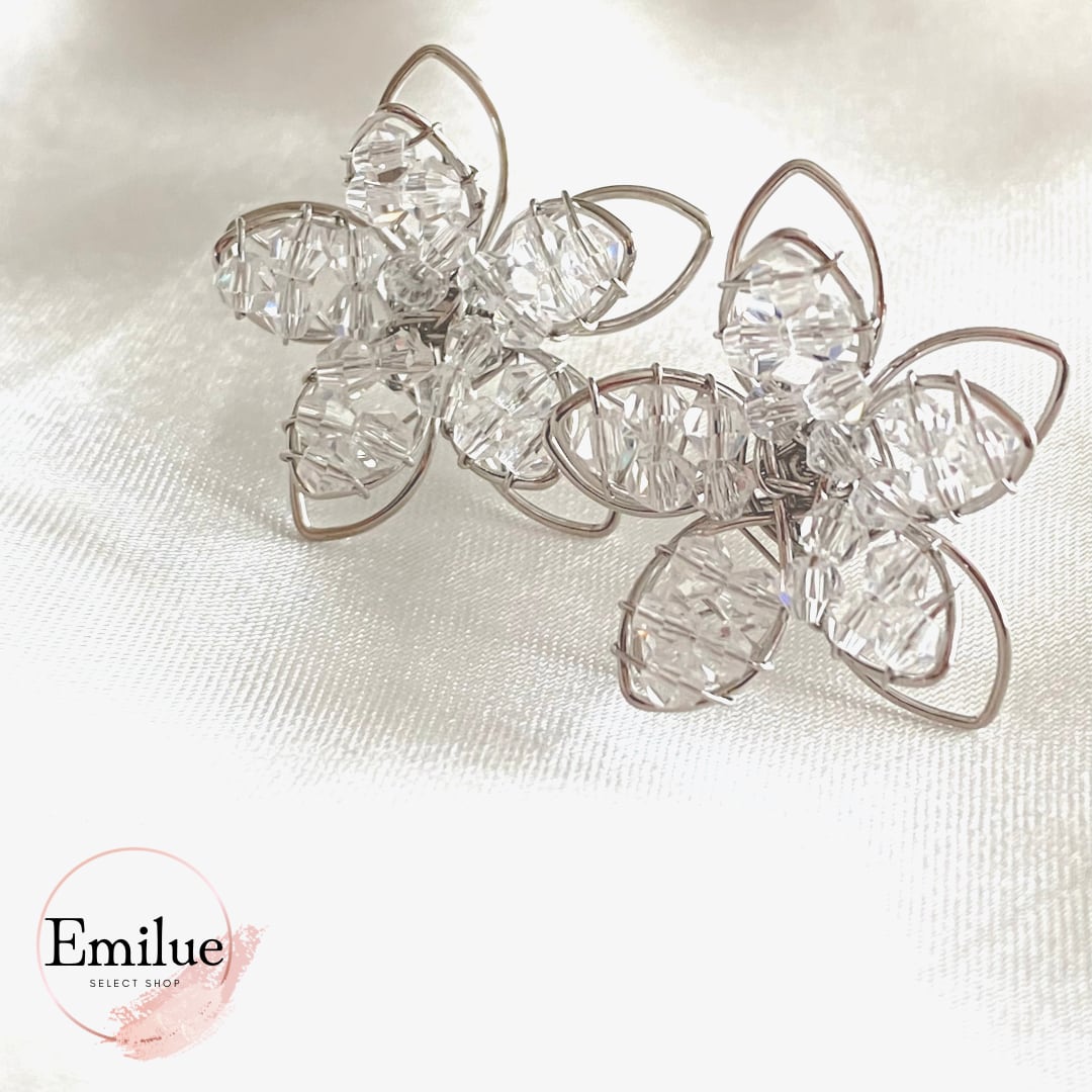ワイヤーのみで施された花びらとクリスタルビーズがあしらわれた花びらの2段式デザインピアス。