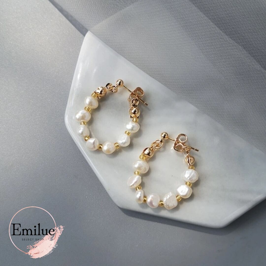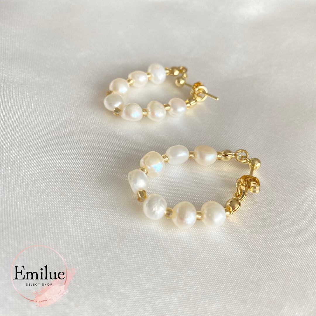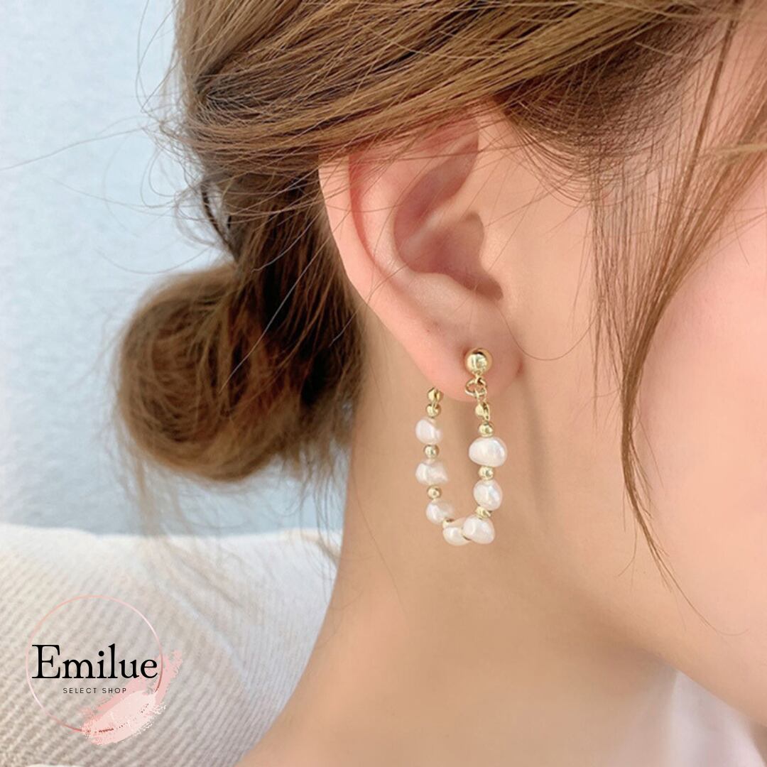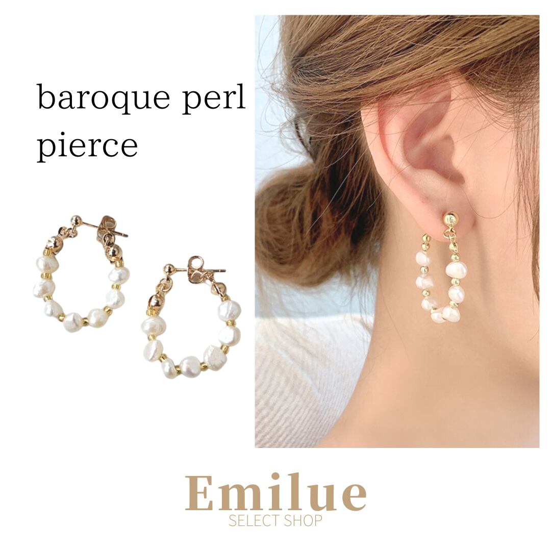 一粒一粒、不揃いな形がこなれ感を演出するバロックパールピアス。カジュアルスタイルに合わせやすいのもポイント。キャッチレスデザインのフープピアス。